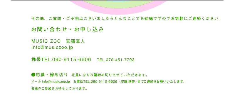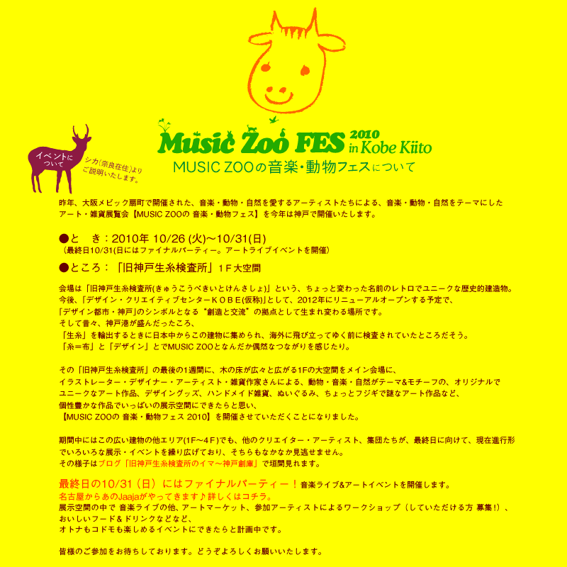 MUSIC ZOO TOPへ MUSIC ZOO FES 2010 MUSIC ZOOの音楽・動物フェス とは? 参加アーティスト 会場アクセス 参加・出展ご希望etc お気軽にお問合せください